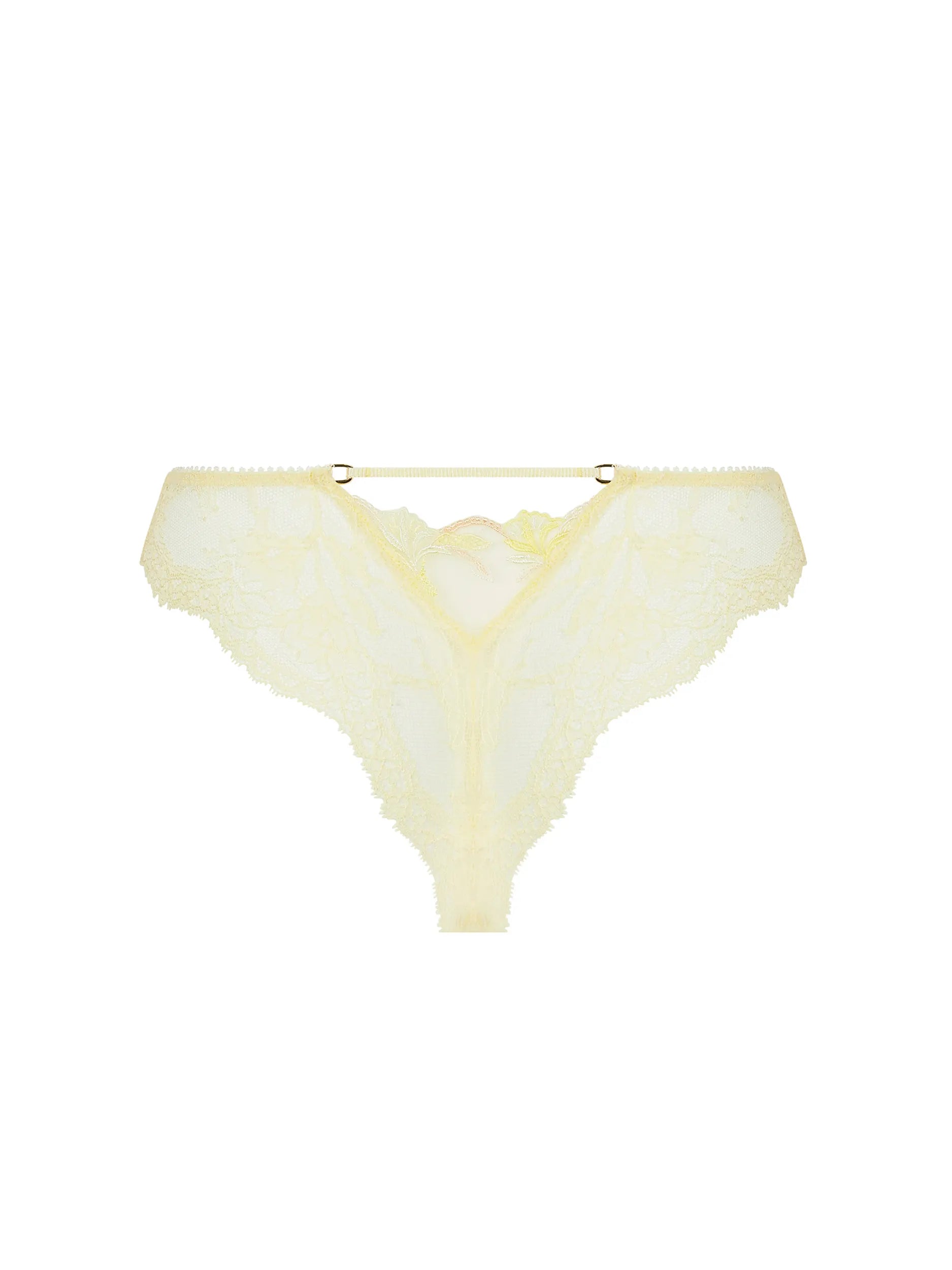 This luxurious thong from Lise Charmel’s Frisson D’Or collection embodies sophistication and allure. Made from sensual lace, it is detailed with elegant golden rings at the back and a multi-thread embroidered triangle at the front, resulting in a richly opulent design. The scalloped edges, low-rise waist, and cheeky rear cut beautifully enhance your curves, creating a flattering and captivating silhouette.