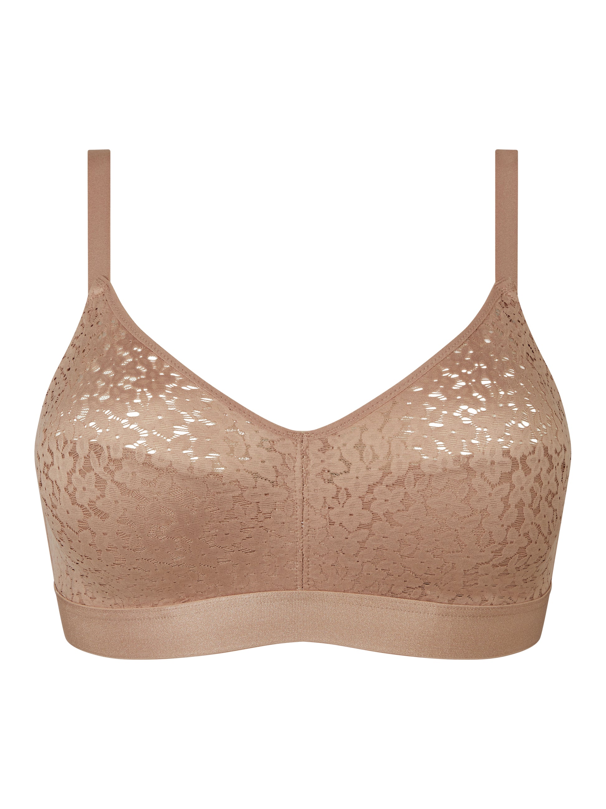 This bralette is wire-free, providing optimal support and coverage. Its ultra soft floral flat-lace molded cups make it a perfect choice for everyday wear. An elastic and soft underbust band ensures the product stays in place. A smoothing effect is achieved with a very covering funnel back crafted from opaque mesh with a seamless finish.